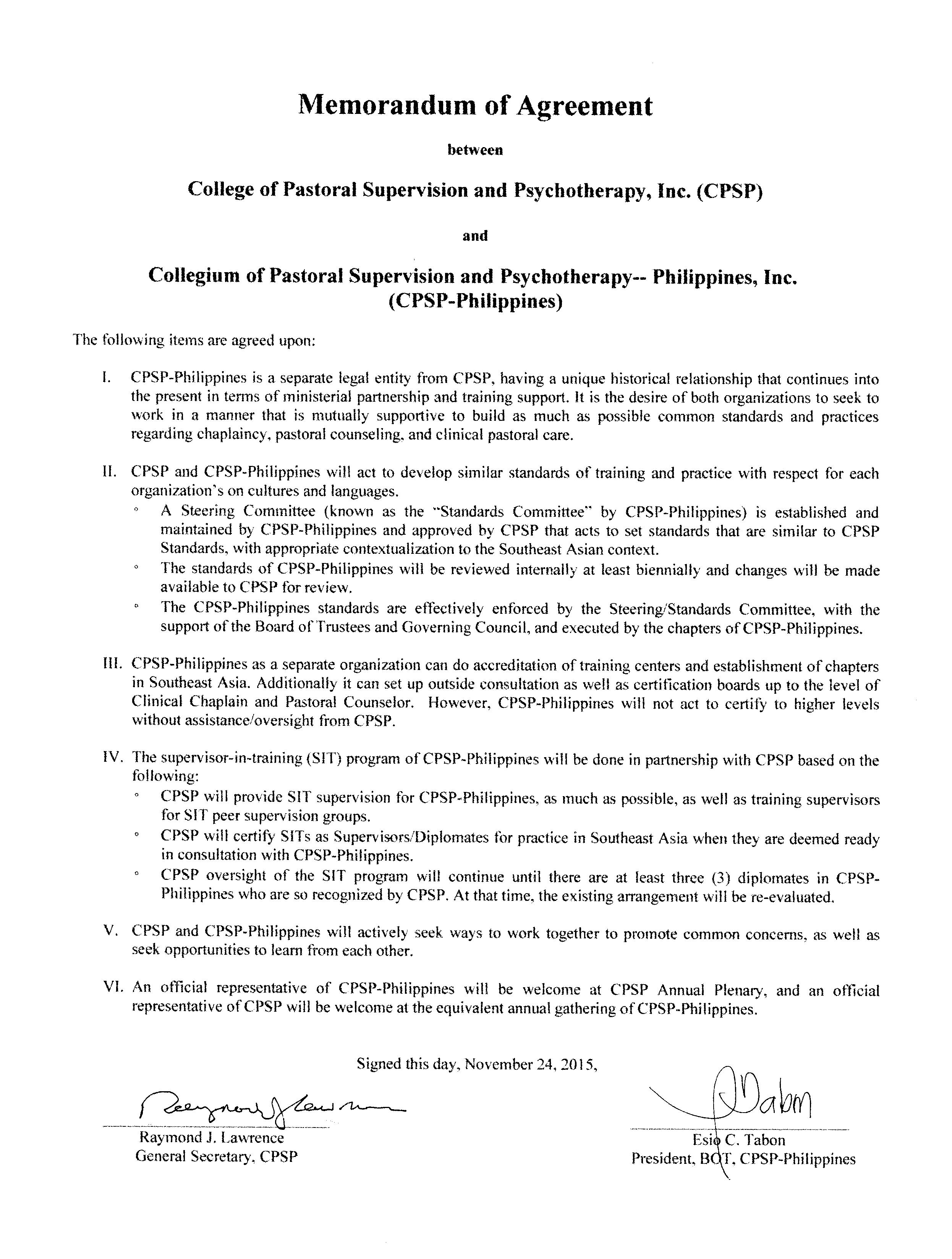 - Memorandum of Agreement between CPSP and CPSP-Philippines